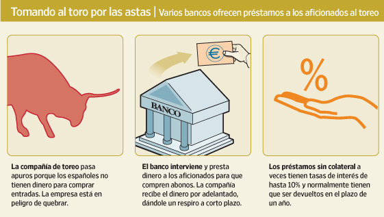 Por eso, a principios de año, la firma sevillana Empresa Pagés, cerró un acuerdo inusual con su banco, Banca Cívica, que estaba a punto de ser absorbido por el gigante nacional Caixabank SA. La entidad accedió a prestar dinero a los fanáticos de los toros para que pudieran comprar abonos para la temporada, que suelen costar varios cientos de euros. Empresa Pagés recibe el monto de los billetes por adelantado. Los aficionados generalmente tienen que devolver el préstamo, con intereses, en el plazo de un año.